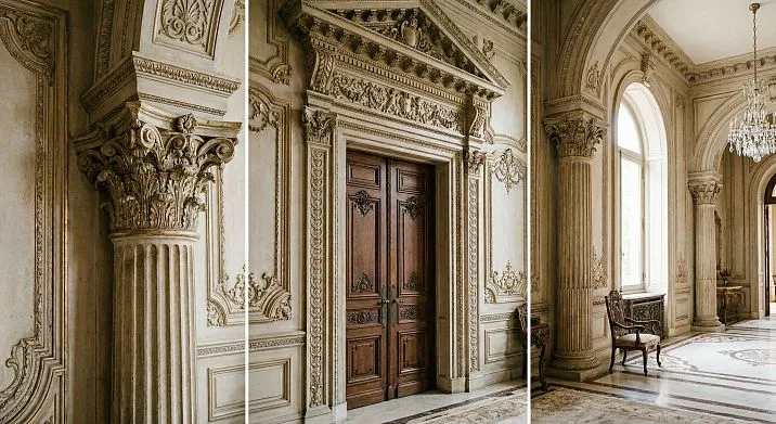 Neoclassicism allows more freedom. Ionic capitals with volutes are possible here, moldings with egg-and-dart ornament (ovolo), light plant motifs on applied elements. The main thing is restraint: ornamentation is present but does not dominate.