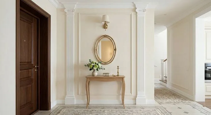 If the hallway has ceilings of 2.7 m or higher — pilasters are especially fitting. Their verticality emphasizes the height, creating a sense of grandeur proportionate to the scale of the room. With low ceilings (2.4 m and below), pilasters should be narrower and lighter to avoid 'lowering' the ceiling even further.