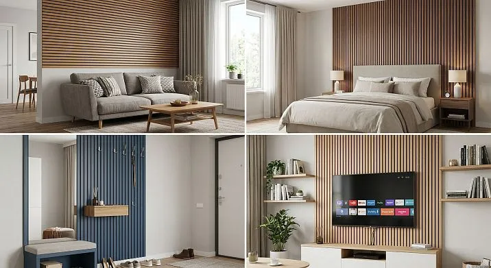 For small rooms — vertical slats with wide spacing in light tones. The vertical rhythm visually raises the ceiling, and wide spacing does not overload the wall. Dark slats in a small space require caution: they visually reduce the space.