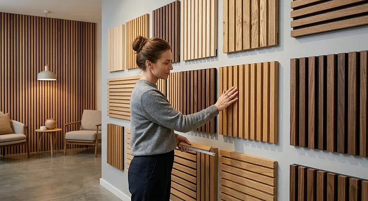 Incorrect choice of wood shade. The tone of the slat must be selected in conjunction with the floor, doors, and furniture. If the floor is light oak, a dark walnut slat will create conflict. The solution is to choose a tone 1–2 shades lighter or darker than the floor.