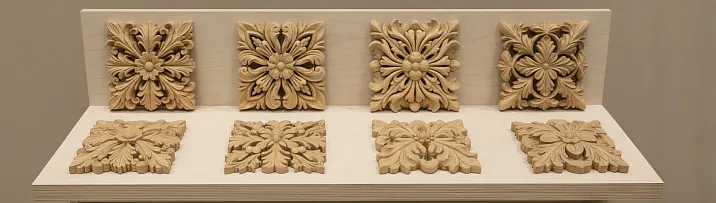 Carving allows creating rosettes of any complexity — from simple round forms with minimal relief to complex multi-tiered compositions with floral ornaments, geometric patterns, and figurative elements. The depth of carving can reach 50-70 millimeters, creating dramatic chiaroscuro effects. Hand-carving gives the rosette individuality, making it a piece of applied art.