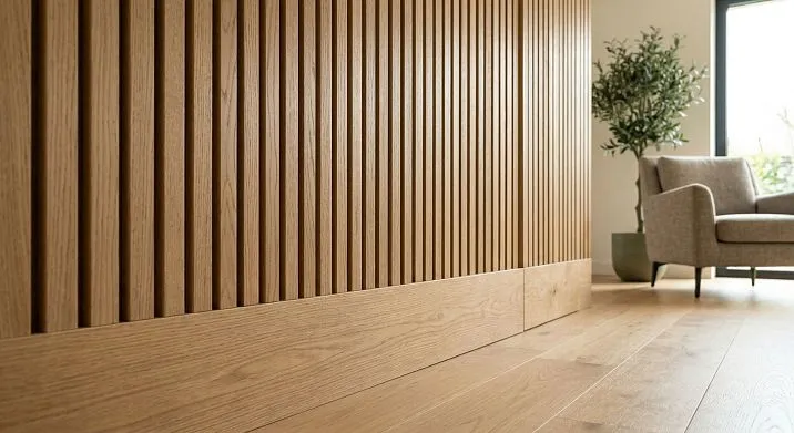 For thin and frequent slats — a flat rectangular skirting board 60–70 mm. For wide slats — a skirting board 70–90 mm with a moderate profile. For an accent slat wall — a calm skirting board without active relief. Wood species — the same as the slats, or from the same tonal group.