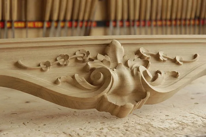 Profiling and decorative elements are milled on high-speed equipment. Spindle rotation frequency is 18000-24000 rpm, ensuring clean processing of hard oak wood. Cooling the cutting zone prevents overheating and charring of the material.