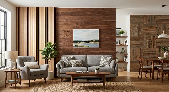 In an apartment, wooden panels for interior wall decoration are best used selectively: one accent wall in the living room, the bed area in the bedroom, a lower band in the hallway. This creates character without overloading the space.