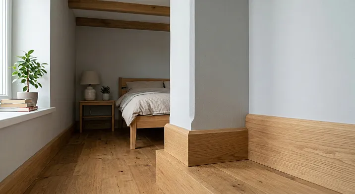 Even a small45 mm wooden skirting boardbaseboard made of beech or oak is a genuine material with a living texture that is visible and tactilely felt. When painted white, the difference is unnoticeable—but in a natural wood tone, wood is incomparable to PVC.
