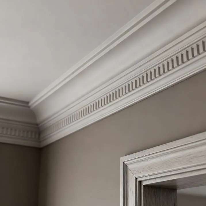 Bio-polymer ceiling cornices maintain ideal geometry over 4-5 meter spans without sagging. Lighter than duro-polymer, simplifying installation, yet stiffer than polystyrene, ensuring stability. Optimal for wide cornices 150-200 mm.