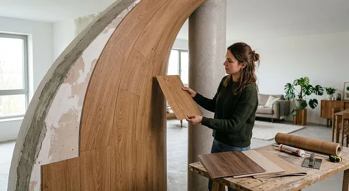 A radius wall with a smooth curve—in an office, restaurant, or apartment with a non-standard layout—requires either manual cutting of a rigid panel into narrow strips or a flexible format. The second option yields a significantly cleaner result with less labor.