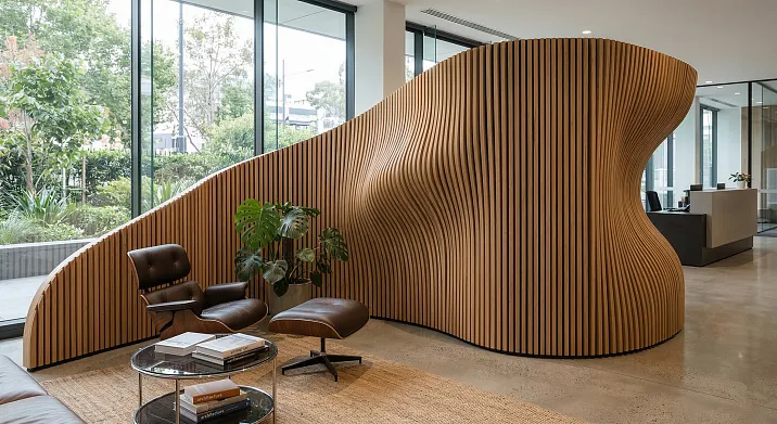 This is the main 'home' for flexible slatted panels. Biophilic design is an architectural concept based on the human physiological need for a natural environment. Organic curves, natural materials, the absence of rigid rectangular forms — this is the language of biophilic space. Flexible wooden slats on rounded surfaces are a direct embodiment of this language.