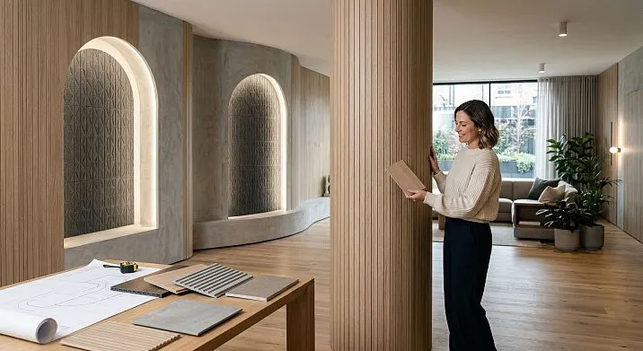 Parallel slats with equal spacing create a rhythmic structure on the wall that interacts with light. With side lighting, each batten forms its own highlight and shadow on the next, turning a flat wall into a sculptural object. Change the angle of the light source—and the character of the surface changes. It looks different in the morning than in the evening. This is what designers call a 'living surface'—and it fundamentally distinguishes slat panels from any printed or painted coating.