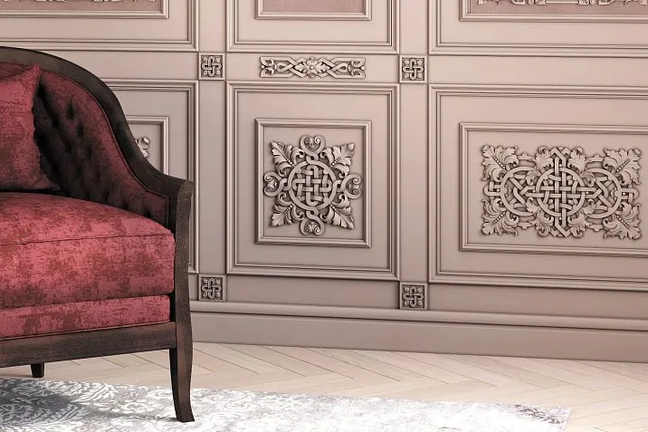 Applied elements allow ordinary furniture to become unique works. Carved appliqués on cabinet facades, decorative elements on chair backs, ornamental inserts on tabletops — all of these create a rich decorative environment.