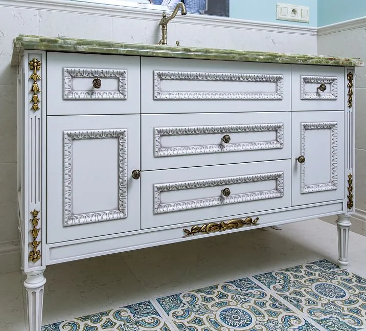Add carved appliqués to cabinet doors, replace standard handles with decorative ones, and update facades with moldings. Such a transformation of furniture will give it a luxurious look and make it the main focal point of the room.