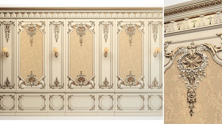 Moldings and cornices help create decorative accents, add depth to walls, and emphasize architectural features of the room. For example, zoning walls with moldings allows you to designate areas for paintings or mirrors.