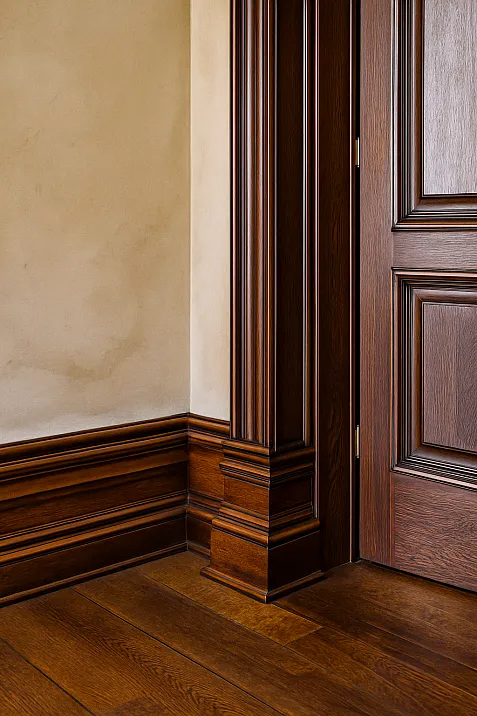 Classic interiors are built on centuries-old architectural logic traditions, where each element carries semantic meaning and adheres to strict proportional laws.Wooden baseboardcreates the architectural base of the wall, from which the entire vertical composition of the room is built.wooden cornicecompletes the wall at the top, forming a smooth transition to the ceiling and creating a visual framing of the space.Moldings from solid woodstructure wall surfaces, forming panel systems of boiserie, which characterize aristocratic interiors of the 17th to 19th centuries.Carved Elementsadd decorative value, transforming utilitarian architectural details into works of art.Wooden plankUsed for creating panelled surfaces and mouldings, where simplicity of lines highlights the nobility of oak or beech wood.