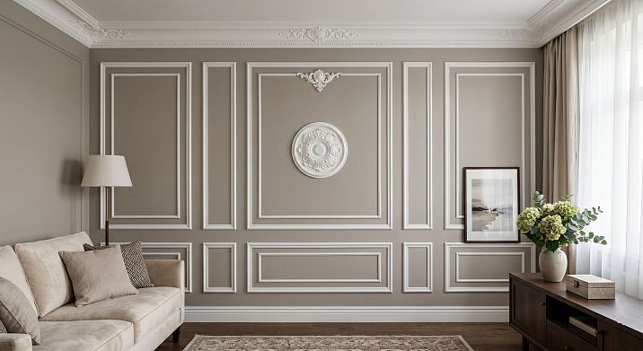 Stucco molding for living room wall — from the Neoclassic, Versailles, and Peterhof collections. For a modern living room with open plan — Neoclassic or Japandi.