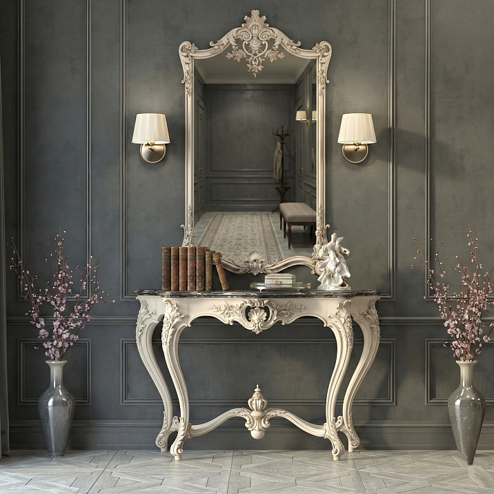 Rococo is a lighter version of Baroque, more playful, with asymmetrical scrolls, floral motifs, and pastel shades (pink, blue, mint). A console with delicate carving, light gilding; a mirror in an asymmetrical frame with rocaille; light walls; light accessories.