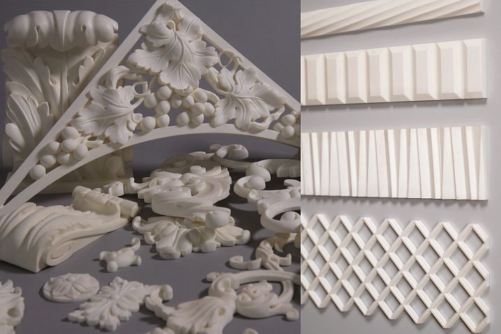 ● Polyurethane moldingsModern material allowing to achieve high detail and ease of maintenance. Polyurethane molding perfectly imitates classical decorative elements, while being resistant to moisture and temperature fluctuations, which is especially important for interior doors.