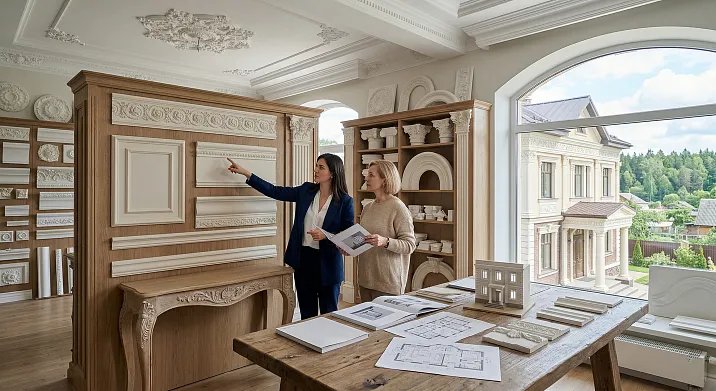 Start with the facade style or interior concept. Classic — developed ornament, complex profiles. Neoclassical — clear lines, moderate relief. Modern classic — concise moldings, minimal ornament. Style is the main filter when choosing.