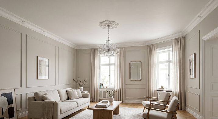 Moldings on the ceiling in an apartment: the main principle of placement is linking to function. A frame above the sofa in the living room: the center of the frame coincides with the center of the sofa group. A frame above the bed: coincides with the central axis of the headboard. A frame above the dining table: along the perimeter of the zone with the chandelier inside. Thin ceiling moldings work as an architectural confirmation of the furniture solution — they say: 'here is a zone, here is a place.'