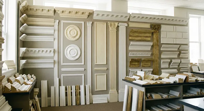 Trim — are linear products sold by the meter: moldings, cornices, trims, skirting boards. Overlay elements — are piece products: rosettes, medallions, brackets, mascaron, capitals. Both types are used in combination to create a complete decorative image.