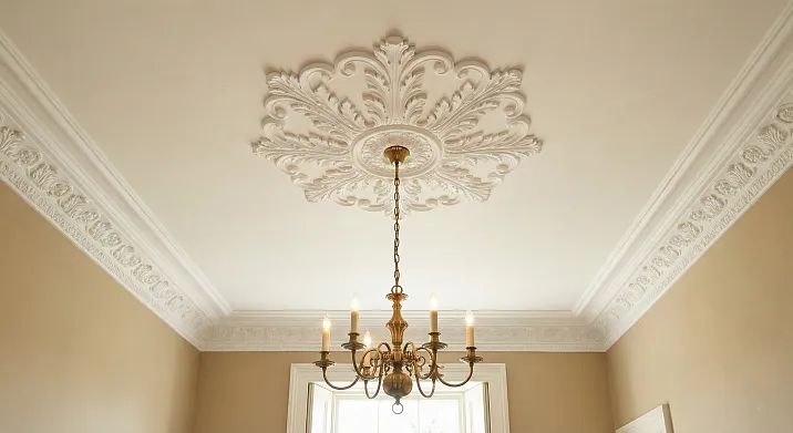 A polyurethane chandelier rosette serves as a visual anchor that attracts the eye. The chandelier ceases to be just a light fixture hanging from the ceiling—it becomes the center of the composition, around which the entire architectural logic of the room is built. The cornice frames the perimeter, creating a frame that psychologically 'raises' the ceiling, making it more structured.