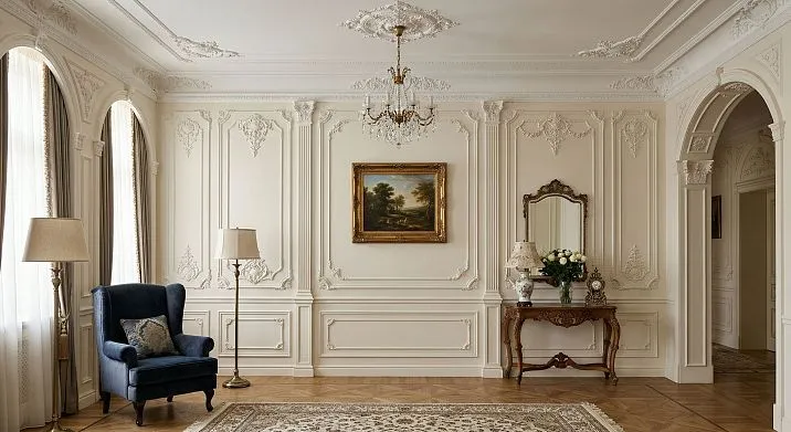 In high-ceilinged rooms (from 3 m), in classical and neoclassical projects, in formal living rooms — boldly use ornamental moldings, overlays, pilasters. Rich relief requires space and height. Without them, it feels oppressive. With them — it creates that very impression people seek in photos.