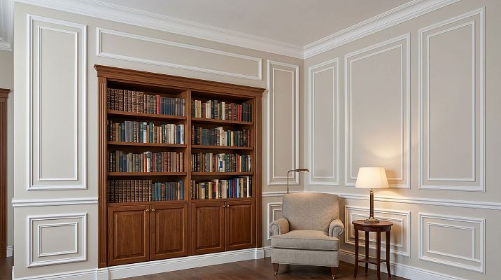 Эта статья — практическое руководство по оформлению книжной стены полиуретановыми молдингами. Со схемами, размерами, цветовыми решениями и стилевыми разборами. Для кабинета, гостиной, спальни и холла.