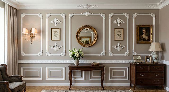 Moldings matching the wall color, a medium-scale frame, a mirror or painting in the center. Without complex ornaments, without opulence — only pure geometry of the frame. Furniture is light or in natural wood, accessories on the surface — in two or three restrained tones.