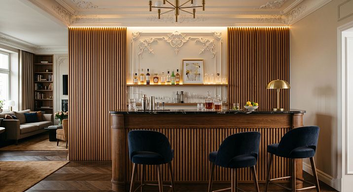 A home bar is not just a shelf with bottles. It's a statement about the owner's character. A bar area, executed with architectural attention to detail, instantly becomes the center of attraction in any space — be it a kitchen-living room, study, hall, or a separate room. And the difference between "just a shelf with drinks" and a real home bar with atmosphere is measured precisely by what happens with the walls, ceiling, cornices, and baseboards around it.