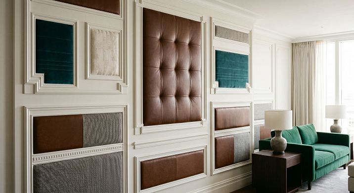 Key rule: the more soft panels, the simpler the moldings — and vice versa. If the wall is rich in texture (velour, velvet, embossing), the moldings should be strict, laconic, matching in color. If the moldings are expressive (corner inserts, overlays, double frame), the fabric should be calm, solid-colored.