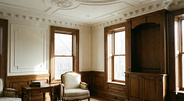 Why this combination works? Because each material occupies its own ecological niche in the interior, using its strengths.Polyurethane moldings— ideal for ceilings and upper wall zones, where lightness, complexity of forms, and moisture resistance are important.Wooden trim— indispensable in lower zones, in areas of hand contact, where tactile sensation, naturalness, and the warmth of a living material are valued.Combined finishingIt allows you to get the best of both worlds — beauty and practicality, tradition and modernity, luxury and reason.