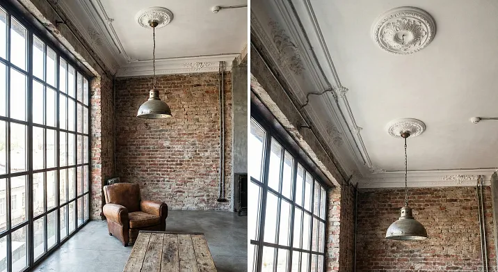 Polyurethane moldingsin a loft — the most unexpected element. Moldings are associated with palaces (Versailles, Winter Palace), neoclassicism (white walls, gilding, opulence). A loft is its opposite (industrial, rough, lack of ornamentation). But it is precisely the contrast that creates the effect.