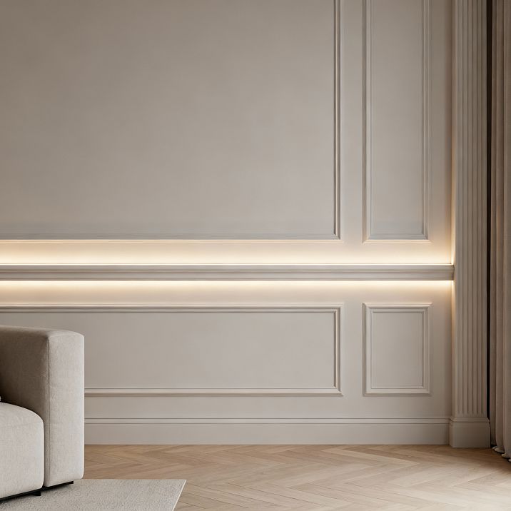 Backlighting the molding from above or below enhances the effect of division. Light directed upward emphasizes the upper part of the wall, making the ceiling visually higher. Light directed downward highlights the lower panel, creating a sense of solidity and stability.