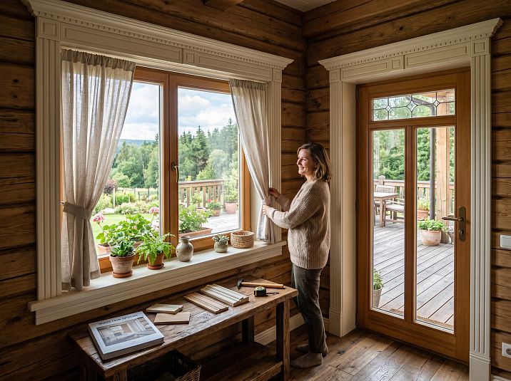 There is always a technical gap between the window frame and the wall. Mounting foam, sealant, plaster — all of this works, but looks untidy. The casing covers this joint, hides installation marks, and makes the opening visually clean. This is especially relevant for a wooden house, where the log or timber has unevenness, shrinkage gaps, and areas that look sloppy without framing.