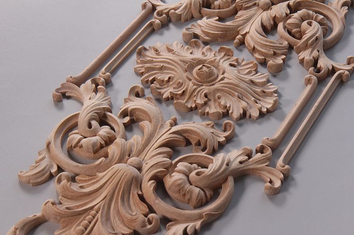 Carved decorative appliqués can be used to decorate kitchen cabinet facades, giving furniture a classical or vintage style. They can be used on chest drawers, table bodies, bookcase facades, as well as in bar counter and side table finishes.