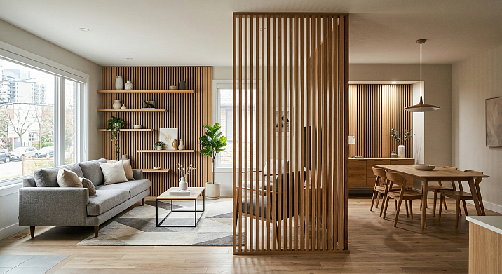 Open floor plans are the norm for modern apartments. A slatted partition or decorative 'screen' made of slats between the kitchen and living areas solves the zoning problem without a solid wall. The space is visually divided but remains unified, airy, and transparent.