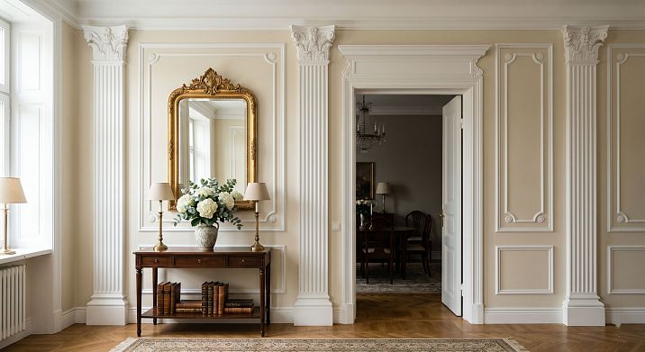 A hallway in an apartment with high ceilings or a foyer in a country house is a space that creates the first impression. Pilasters here work in a dual way: they create a vertical rhythm and signal the character of the entire interior.
