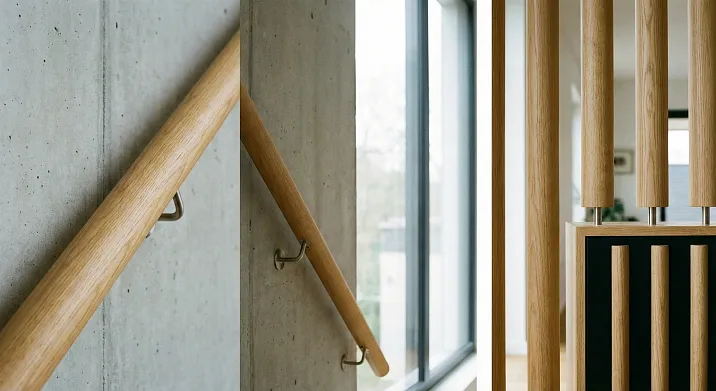 Oak or beech. Hardness of 3.7-4.0 on Brinell ensures resistance to wear even with hundreds of daily contacts. For a family home with four people, larch (cheaper, sufficiently strong) is suitable. Pine and birch are not recommended for heavily used handrails — they are soft and wear quickly.