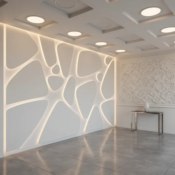 Relief depth varies from delicate 5-10 mm to expressive 40-50 mm. Fine relief creates texture, noticeable under certain lighting, not dominating the space. Deep relief — dramatic effect, play of shadows, architectural expressiveness.