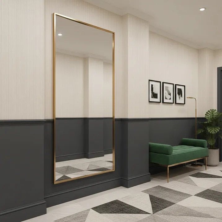 - Full-length floor mirror + high baseboard around the perimeter: architecture of luxury