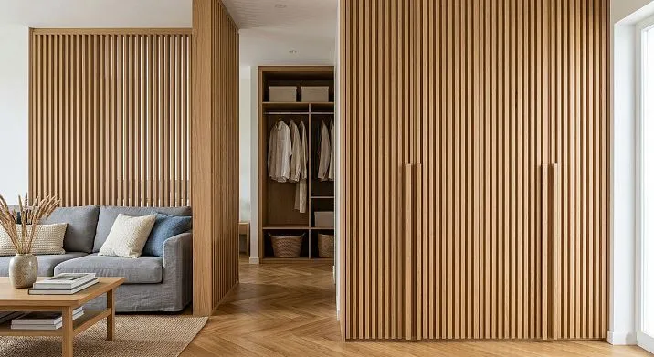 In apartments with niches for walk-in closets — built-in wardrobes from wall to wall. Here, a slatted partition may not be a separate object, but an element integrated into the overall system: slats as part of the wardrobe's side panel or as a dividing section between the wardrobe and the passageway.