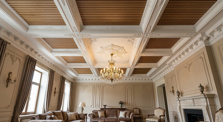Одно из самых впечатляющих потолочных решений, которое объединяет реечные панели и лепнину на потолке, — кессонная система. Молдинговые рамки из полиуретана делят потолок на прямоугольные поля-кессоны, внутри каждого из которых — фрагмент реечной плоскости. Это прямая отсылка к историческим кессонным потолкам, которые со времён Древнего Рима символизировали архитектурное совершенство.