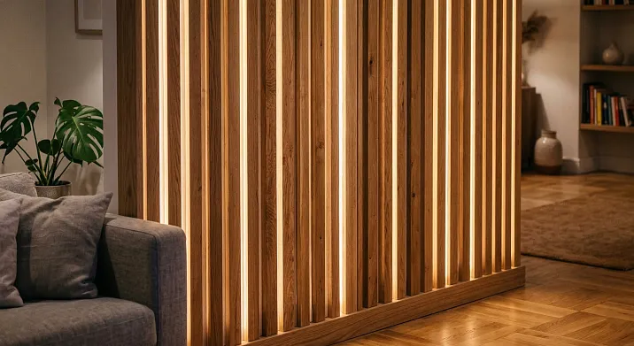 Specific scenario: accent wall behind the sofa—vertical dark oak battens 35 mm wide, 20 mm gap, 'anthracite' tint. Behind the battens—warm white (2700K) LED strip in horizontal grooves of the backing. Main living room lighting—dimmed. The batten wall lighting is turned on—and the living room instantly transforms: dark battens against a warm glowing background, soft reflected light on the sofa and floor, an atmosphere that no ceiling fixture can create.