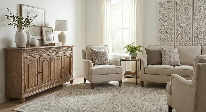 The sofa is the central element of the living room. In classic collections, it is a three-seater sofa, 200-240 cm long, with a tall carved back, carved armrests, and on carved legs. Upholstery—fabric (jacquard, velour, linen) or leather, in a color palette matching the overall style. Upholstery color—neutral (beige, gray, cream) or saturated (burgundy, emerald, blue), depending on the interior concept.