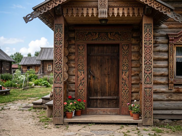 Here, carving is organic by definition. Wood as a wall material and wood as a trim material speak the same language. A carved wooden trim on a log house looks as natural as an ornament on birch bark. Deep three-dimensional carving, lush side posts, an upper "cap" with a figured finish — a classic of wooden architecture that never goes out of style.