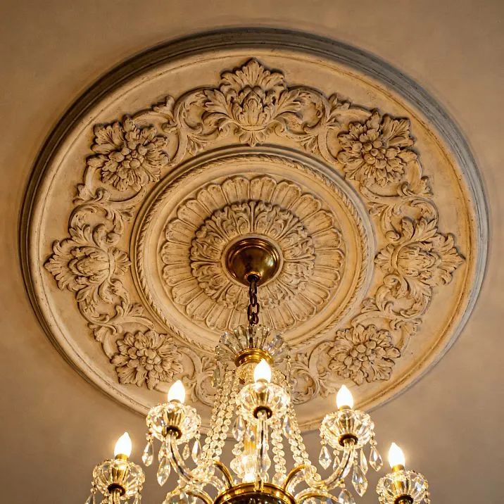 Answer: Use light and shadow effects through painting. Apply the patina technique: apply a darker shade (gray, brown) to the recesses of the ornament, leaving the raised parts light. This visually deepens the relief. You can also install hidden perimeter lighting (LED strip with a small offset) around the rose, creating a 'floating' effect and highlighting every detail of the ornament.