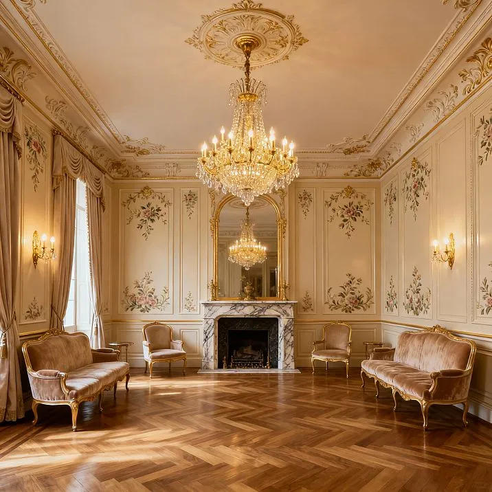 Boiserie reached its peak in France in the 17th-18th centuries under Louis XIV and Louis XV. The Palace of Versailles demonstrates the highest examples - panels made of oak and walnut, painted in white, cream, light blue with mandatory gilded protruding elements. The framed structure divided walls into rectangular sections, each with a central panel, framed by carved moldings.