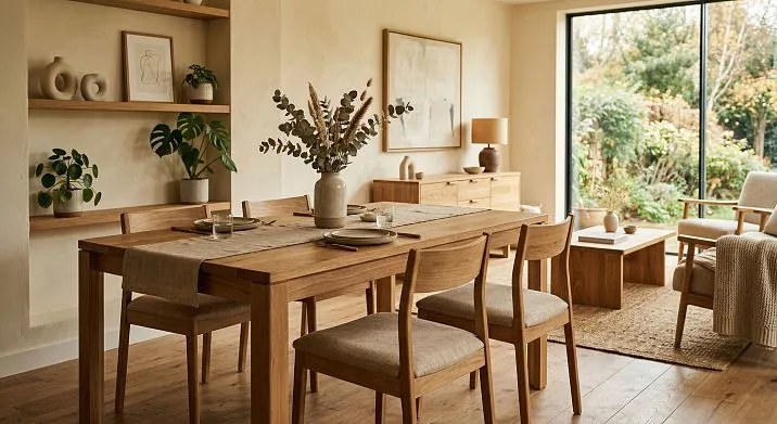 A dining area with one wooden table and chairs is possible without overload if the walls and floor are neutral. A bedroom with a wooden bed and nightstands is warm and organic. A study with a wooden desk and shelving is a classic 'smart' space.