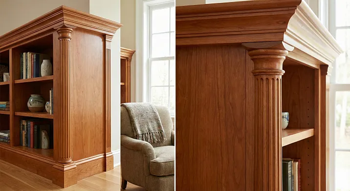 Structurally, a corner column can be applied or recessed. An applied column is attached to the front plane of the cabinet's side wall, protruding in front of the facade. A recessed column is installed into the corner, partially set into the body, creating a more organic connection.
