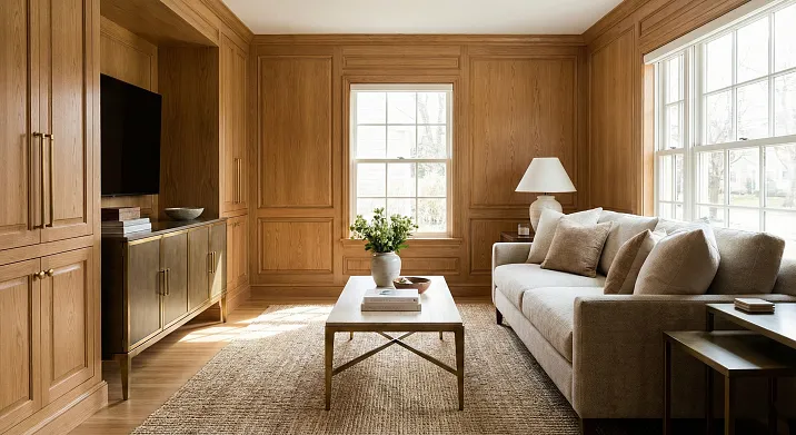 Decorative wall finishing with woodIn natural shades, it dictates the selection of furniture elements in the same color temperature. Warm woods—oak, walnut, cherry—coordinate with warm tones in wall finishes. Cool light woods—white oak, beech, maple—harmonize with Scandinavian palettes and gray tones.Hardware in the interior styleIt should consider these color temperature relationships.