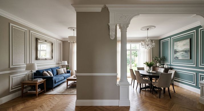How does it work? The wall behind the sofa — the main element of the living room zone — gets a decorative frame system. The wall behind the dining table — its own accent decor. The transition between zones can be marked by vertical profiles or a change in wall design.stucco decor for a kitchen-living room — with a detailed breakdown of zoning for open-plan layouts.